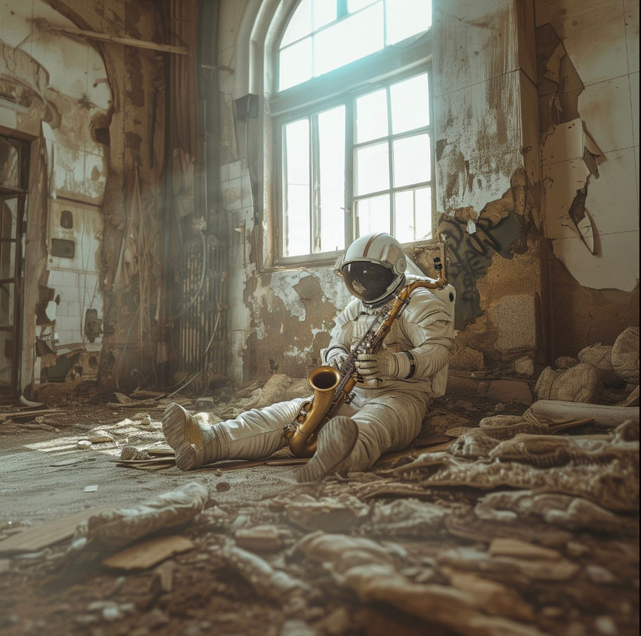 Discover "The Solitude of Astroman", a unique work by Rudy Barret that mixes the melancholy of music with the isolation of space exploration. In this post- apocalyptic scene, an astronaut, sitting among the debris of a ruined building, plays the saxophone alone. The contrast between the spacesuit and the musical instrument gives o" a powerful emotion, symbolizing solitude and resilience in the face of adversity.